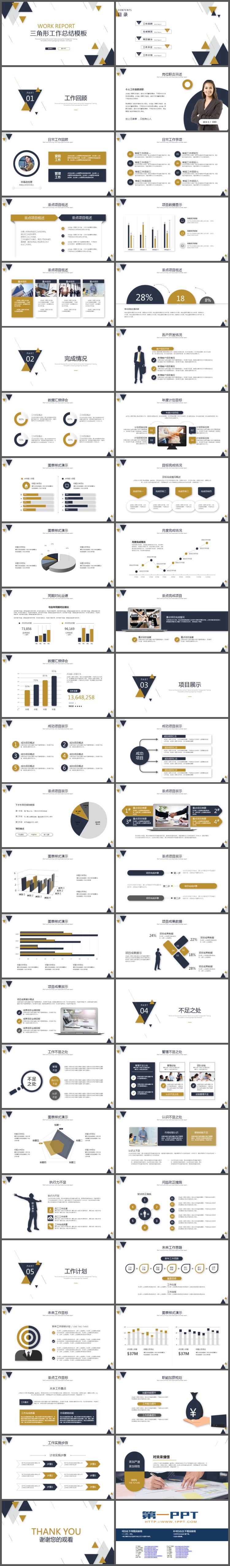 这是一套蓝黄三角形背景的工作总结PPT模板,共47页;