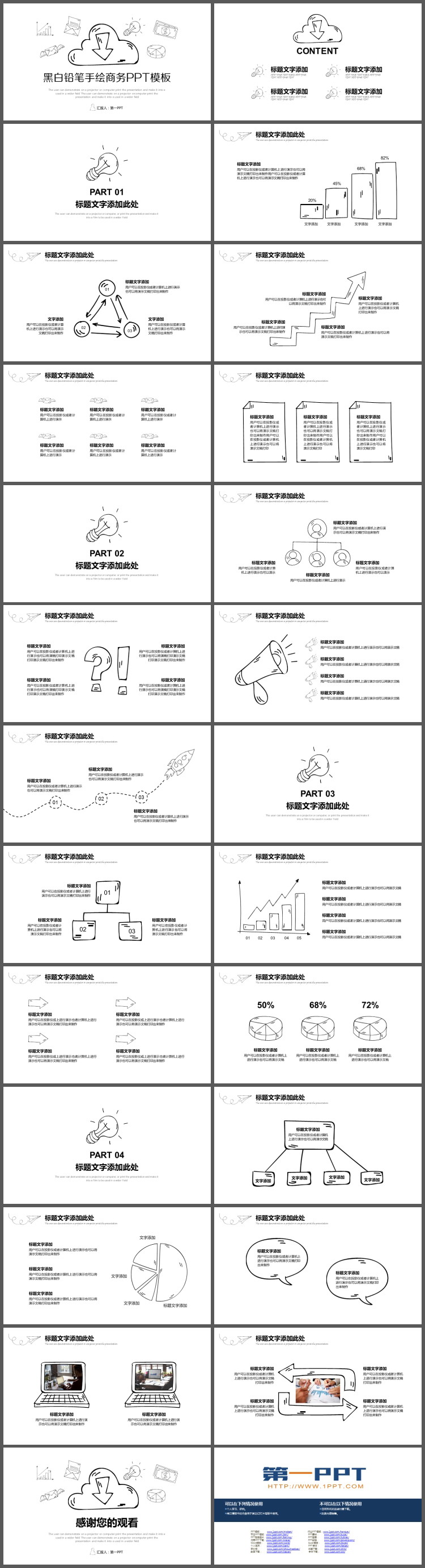 这是一套黑白铅笔手绘商务PPT模板,共25页;