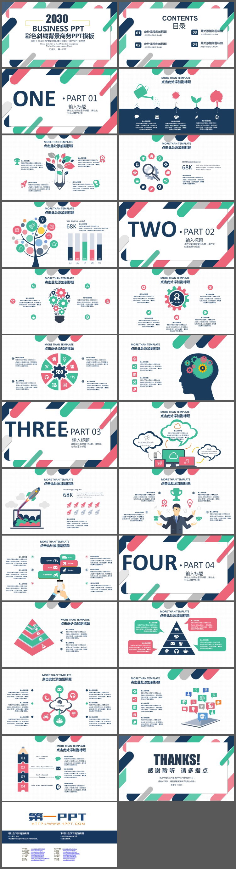 时尚彩色斜线背景商务PPT模板免费下载,共24页;