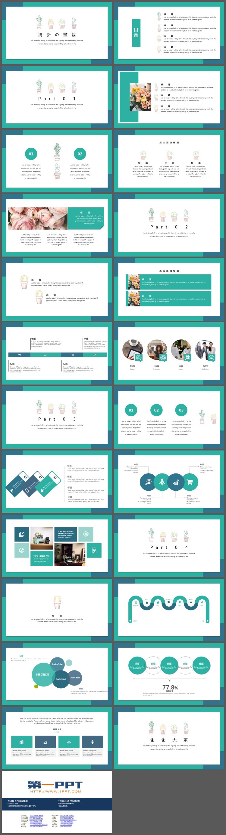 绿色简洁盆景背景PPT模板免费下载,共24页;