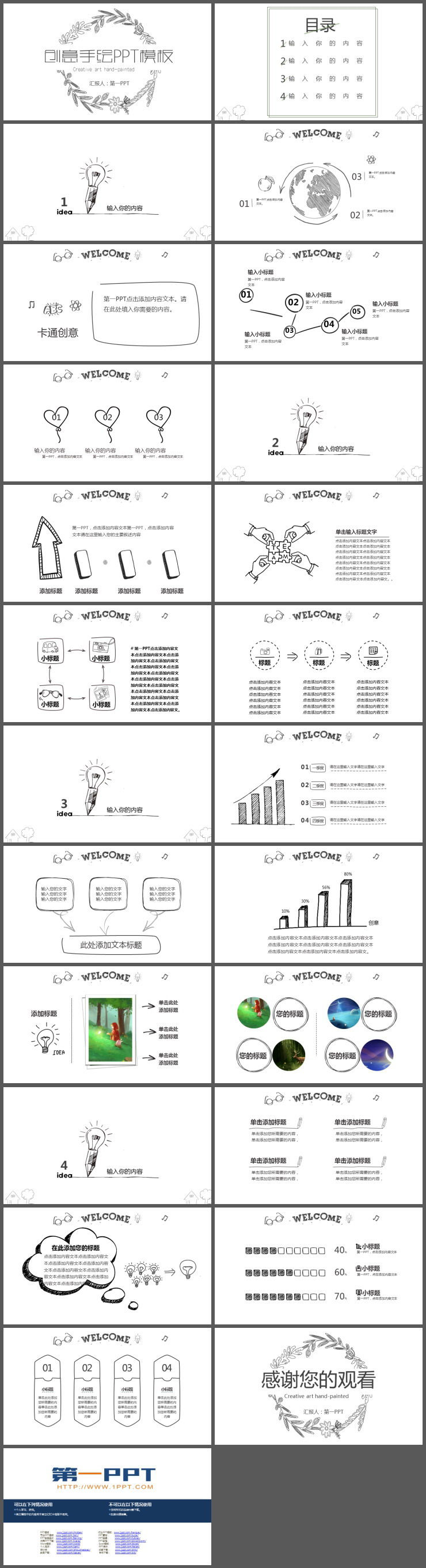 PowerPoint模板内容页,由22张黑色手绘细线幻灯片图表,搭配PPT文字排版。另外使用了手绘电灯泡、铅笔、地球等插图装饰。