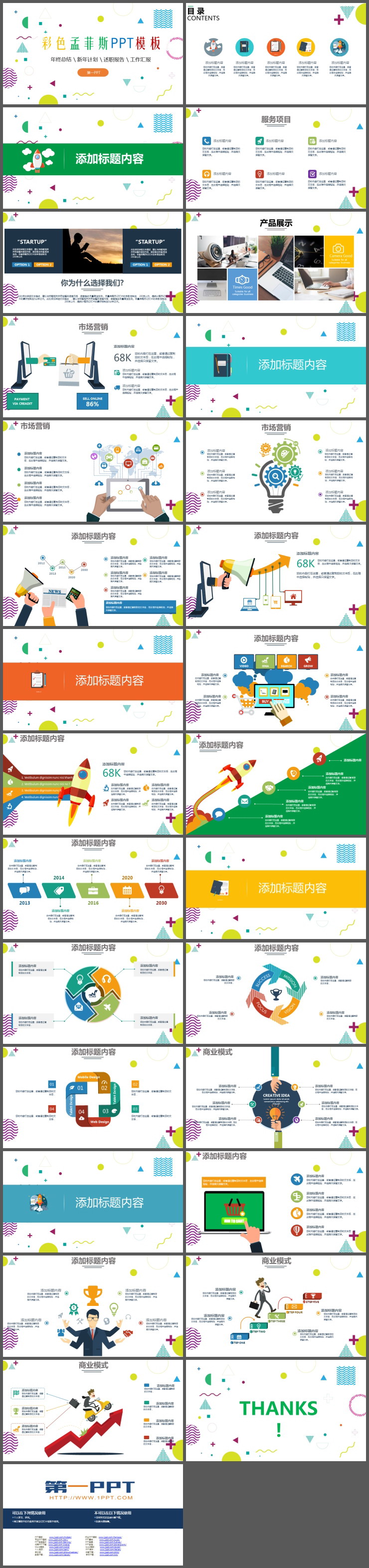 彩色多边形背景的孟菲斯风格PPT模板,共28页;