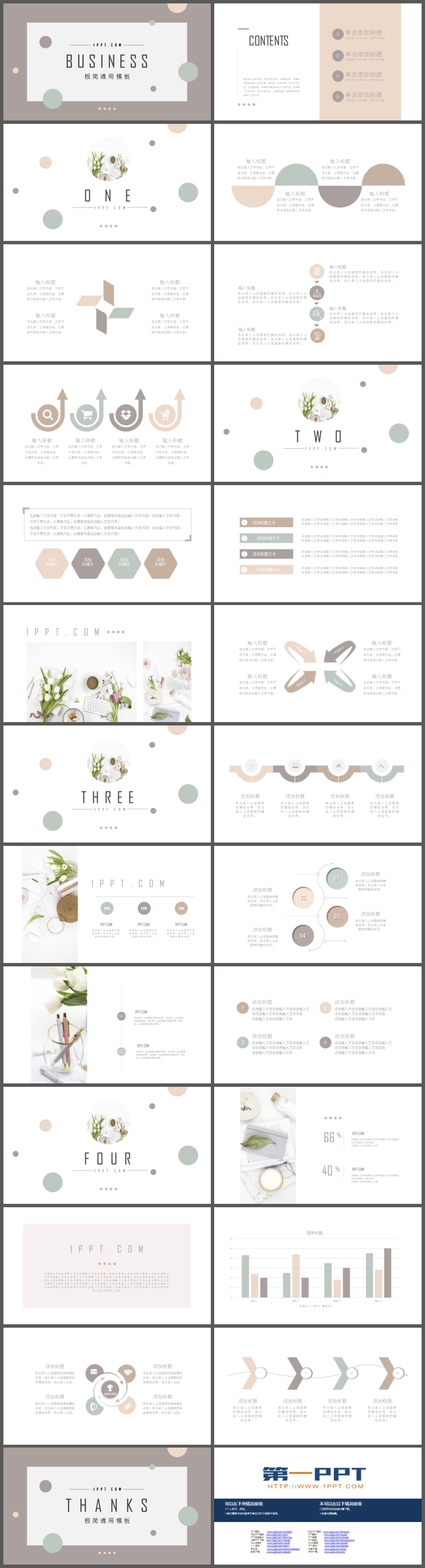 PowerPoint模板内容页,由23张莫兰迪色幻灯片图表,搭配PPT文字排版。另外使用了植物鲜花插图、简约办公桌面插图等装饰。