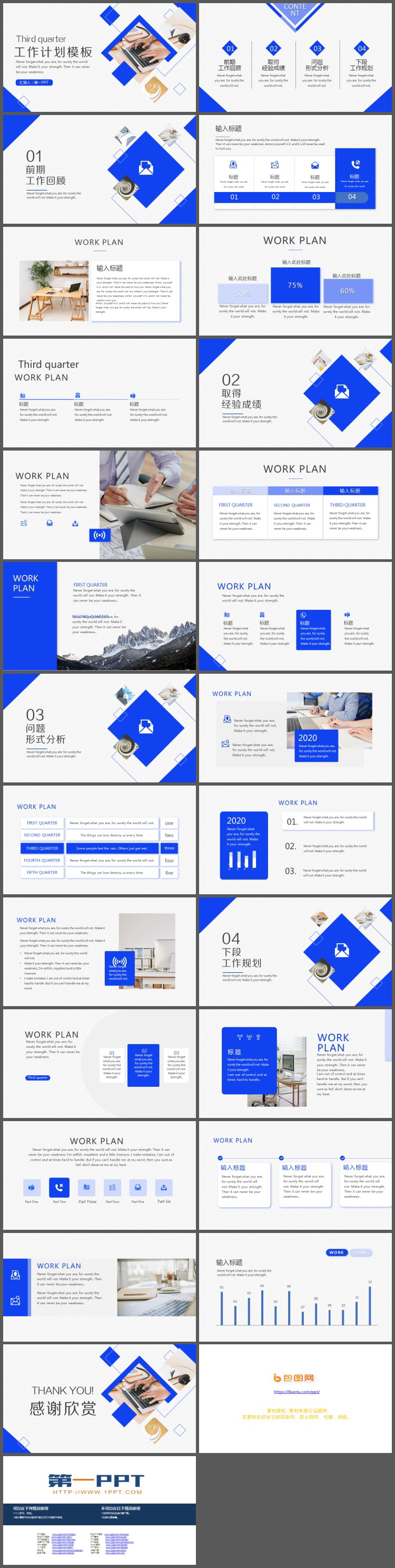 这是一套蓝色办公背景的工作总结计划PPT模板,共25页;