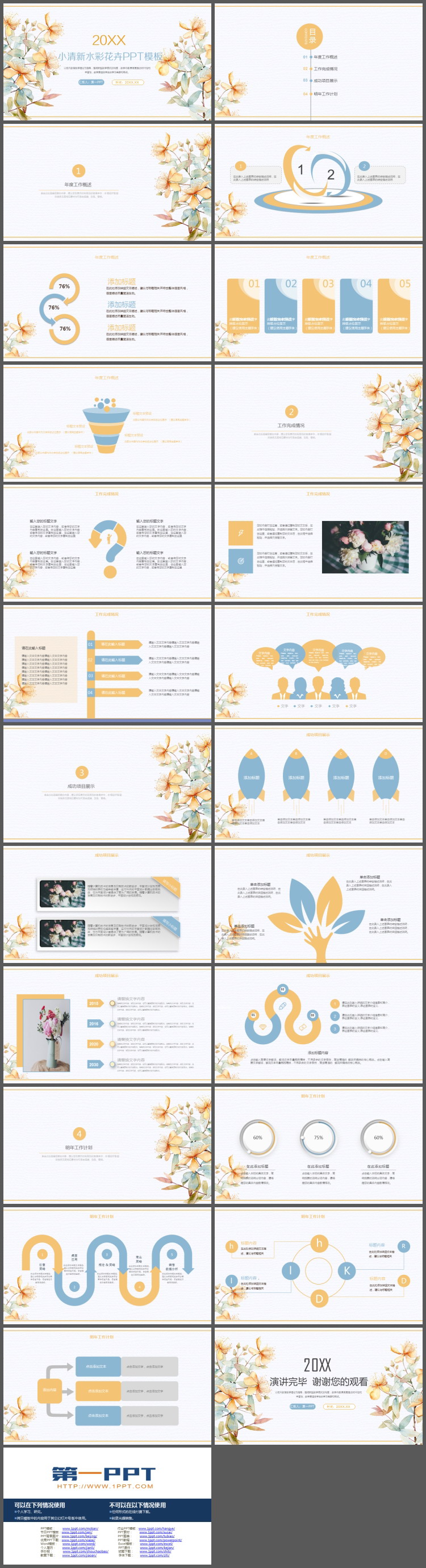 PPT模板封面使用了水彩绘制的橙色花卉背景图片。中间填写PPT标题。界面风格简洁清新。