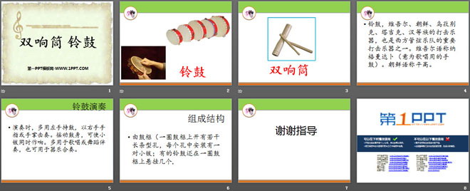 关键词:双响筒铃鼓教学课件,一年级下册音乐PPT课件下载,一年级音乐幻灯片课件下载,双响筒铃鼓PPT课件下载,.PPT格式;