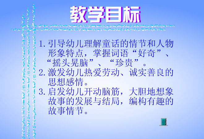 1.引导幼儿理解童话的情节和人物形象特点,掌握词语“好奇”、“摇头晃脑”、“珍贵”。
