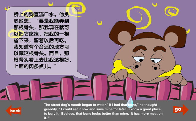 有一回,狗从肉店里偷了一根骨头。他飞快地穿过街道,穿过村里的草地,下了小山,来到一条小河的便桥上。他停下来,喘喘气,看着十分清澈的河水。
