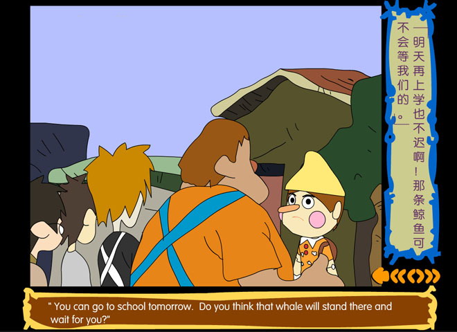 结果有一天,皮诺奇在上学的路上,遇到了几个平时的伙伴,他们对皮诺奇说∶“你听到重大新闻了吗? 在这儿附近的海面上,出现了一条鲸鱼,看上去像一座山呢。”