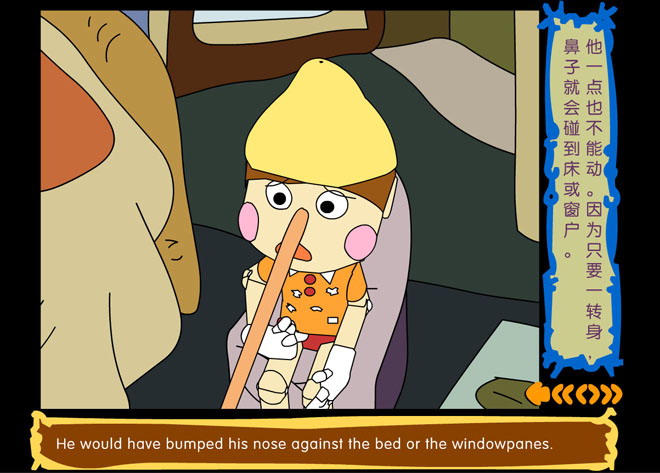 “我把它们弄丢了”皮诺奇说谎了,其实金币就在他的口袋里。他的谎话刚说完,本来就很长的鼻子,又长长了两指。