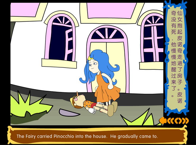 皮诺奇绝望地用脚踢门,这时窗户里出现了一个漂亮的小泵娘。蓝蓝的头发,白白的脸。她对皮诺奇说∶“这个屋里没人。”