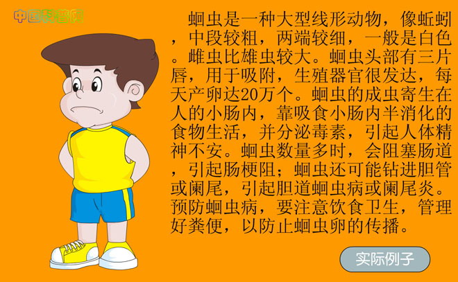 蛔虫是一种大型线性动物,像蚯蚓,中段较粗,两端较细,一般是白色。雌虫比雄虫较大。蛔虫头部有三片唇,用于吸附,生殖器官很发达,每天产卵达20万个。蛔虫的成虫寄生在人的小肠内,靠吸食小肠内半消化的食物生活,并分泌毒素,引起人体精神不安。