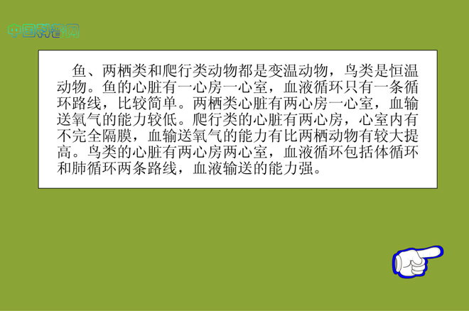 鱼、两栖类和爬行类动物都是变温动物,鸟类是恒温动物。鱼的心脏有一心房一心室,血液循环只有一条循环路线,比较简单。