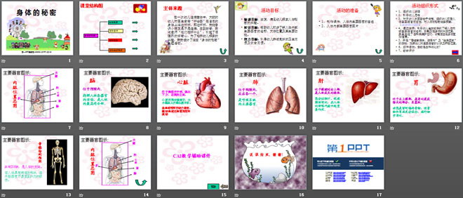 3、对于幼儿的回答给予肯定,组织幼儿观看人体主要器官的自述,对人体的秘密继续探索:(课件部分展示)