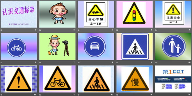 本课件由第一PPT整理发布,教育小朋友认识各种交通指示牌,学习交通知识,注意交通安全,是很好的幼儿园社会PPT课件,敬请下载!