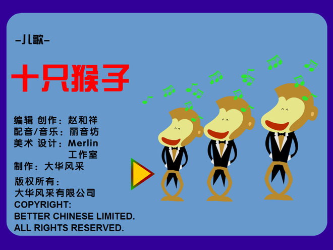 关键词:十只猴子教学动画课件,幼儿园音乐Flash动画课件下载,幼儿园音乐Flash动画课件下载,十只猴子Flash动画课件下载,.swf格式;
