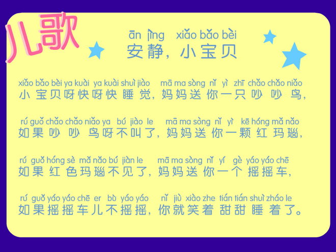 小宝贝呀快呀快睡觉,妈妈送你一只吵吵鸟,如果吵吵鸟呀不叫了,妈妈送你一颗红玛瑙,如果红色玛瑙不见了,妈妈送你一个摇摇车,如果摇摇车儿不摇摇,你就笑着甜甜睡着了。