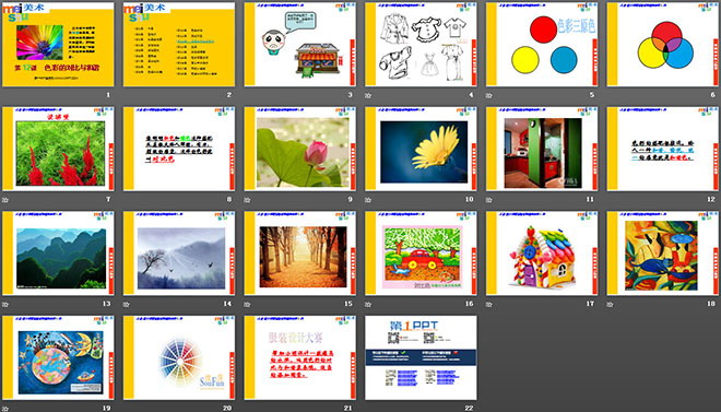 本课件通过大量的精美图片展示了小学美术中色彩的对比与和谐的教学内容,是非常好的小学美术教学课件。