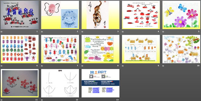 课件中包含很多手指印制成的画,其中包含大部分为学生作品欣赏,学习《美丽的印纹》中的美术知识点。