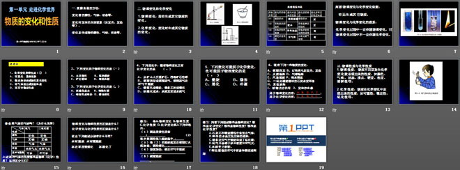 关键词:走进化学世界教学课件,物质的变化和性质教学课件,人教版九年级上册化学PPT课件下载,九年级化学幻灯片课件下载,走进化学世界PPT课件下载,物质的变化和性质PPT课件下载,.PPT格式;